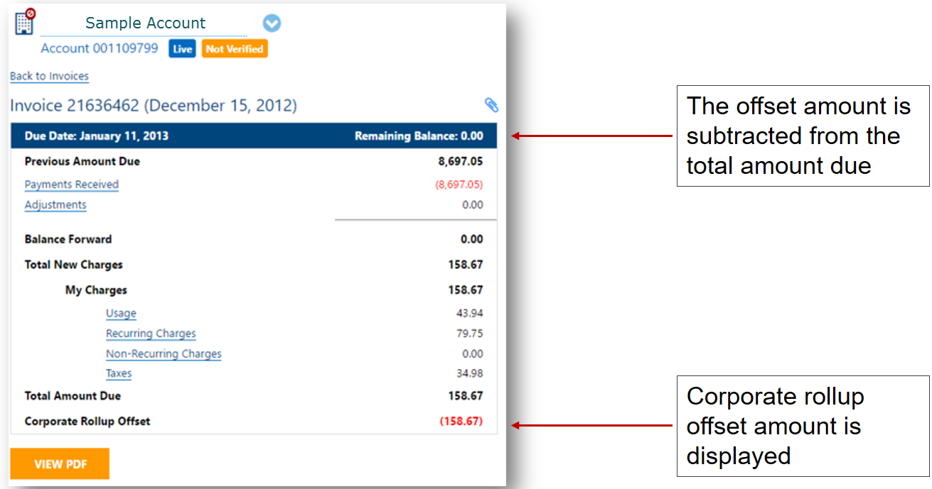 - Corporate Roll-up offset is displayed after the child’s total amount due