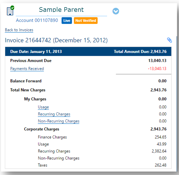 - Invoices for child accounts with pre-existing debit balances will show both the previous amount due amounts and the corporate roll-up amounts. The invoice field ‘Remaining Balance’ for these accounts will not be zero.