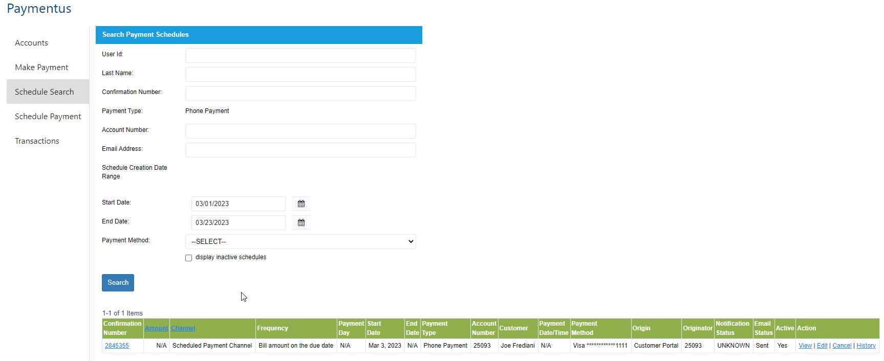 Also, from the transaction history page you can search for transactions by account and/or payment type.